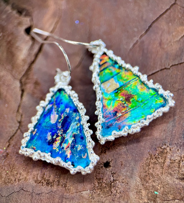 一千年以上かけて虹はだれがかいたの..? 『時間というアーティストが描いた虹』 ローマングラスピアス タテ23mm(枠外側) ヨコ22mm 重さ 9.8g(ペアで) ツブツブ取り巻き オリジナル一点物手造り
