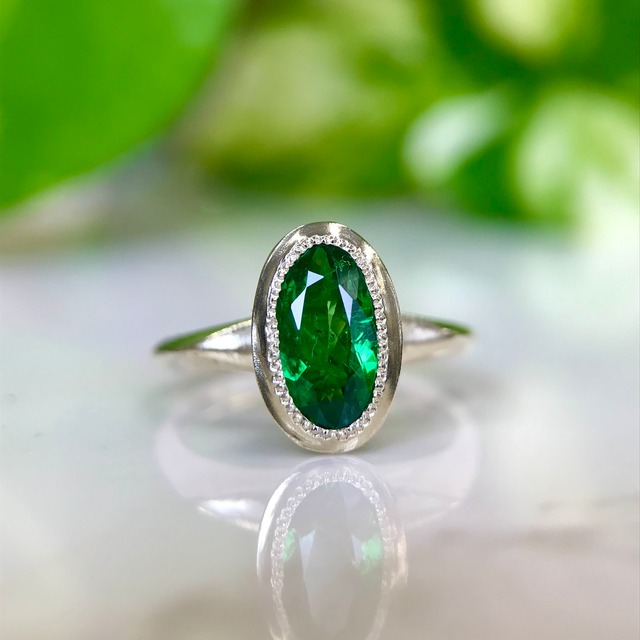 深い緑に癒される! ツァボライトガーネット8mm×4mm 石枠K14 1.4g silver925リング6g(全体の重さ) オリジナル手作り一点物 サイズの変更は無料でいたします。