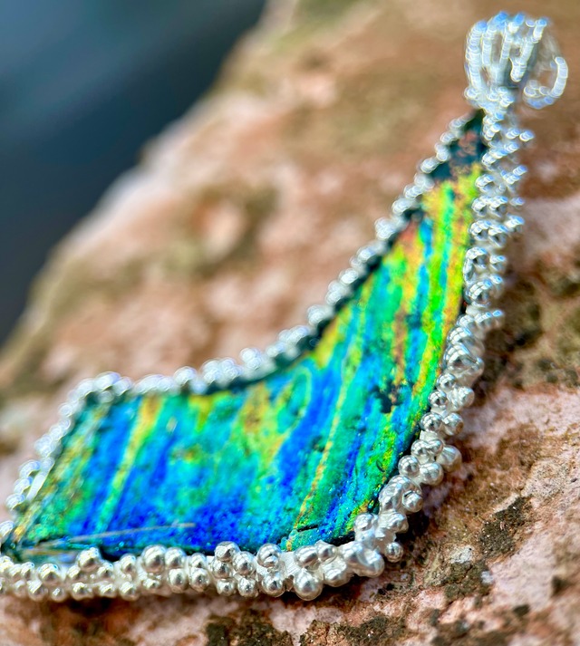 耐えたガラスは宝石になった 熱い砂の中ガラスは化粧していた虹色を纏っていた甦ったガラスに人は驚嘆した silver925ペンダント タテ6.2cm ヨコ2.4cm(枠全体) 重さ19g ツブツブ取り巻き オリジナル一点物手造り