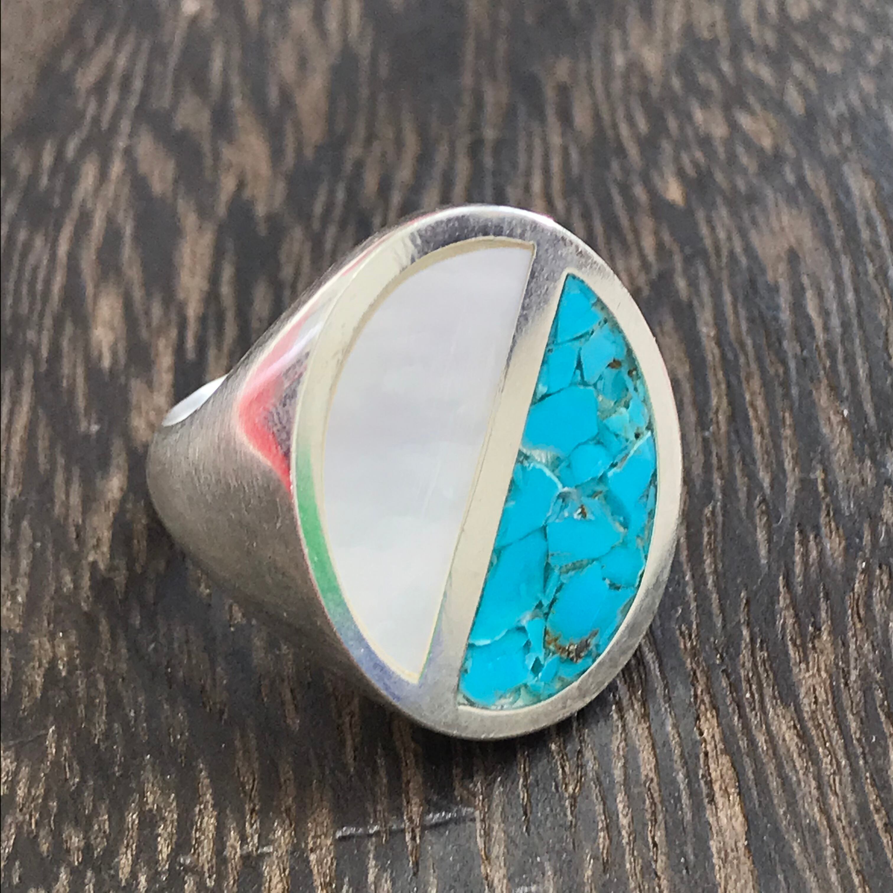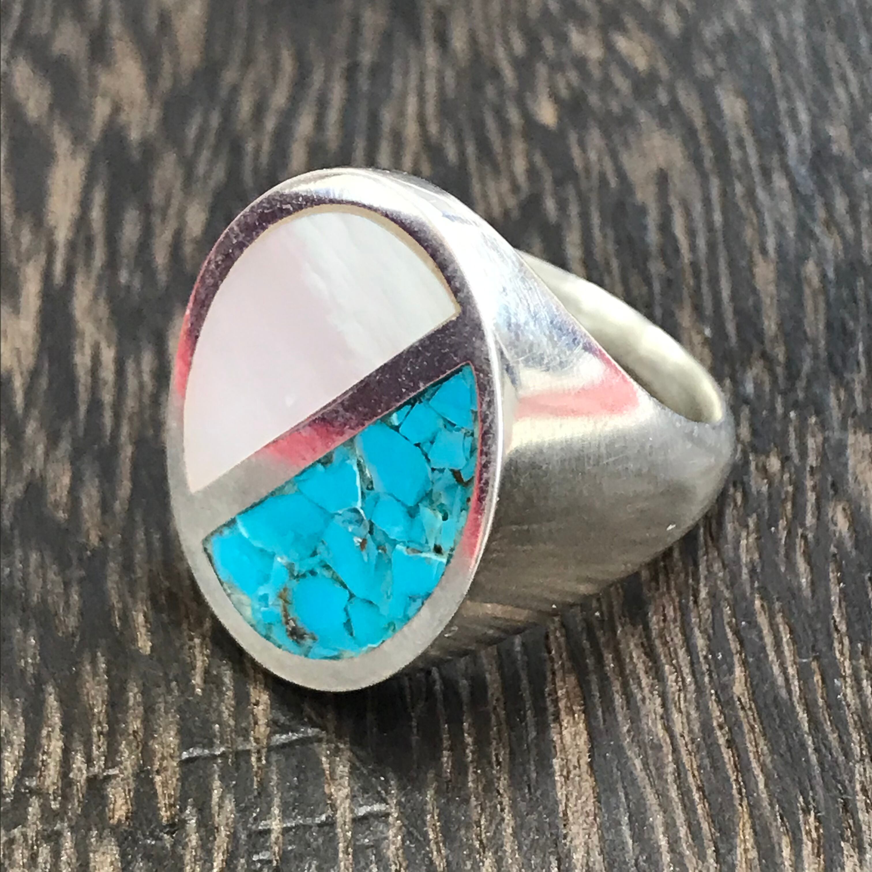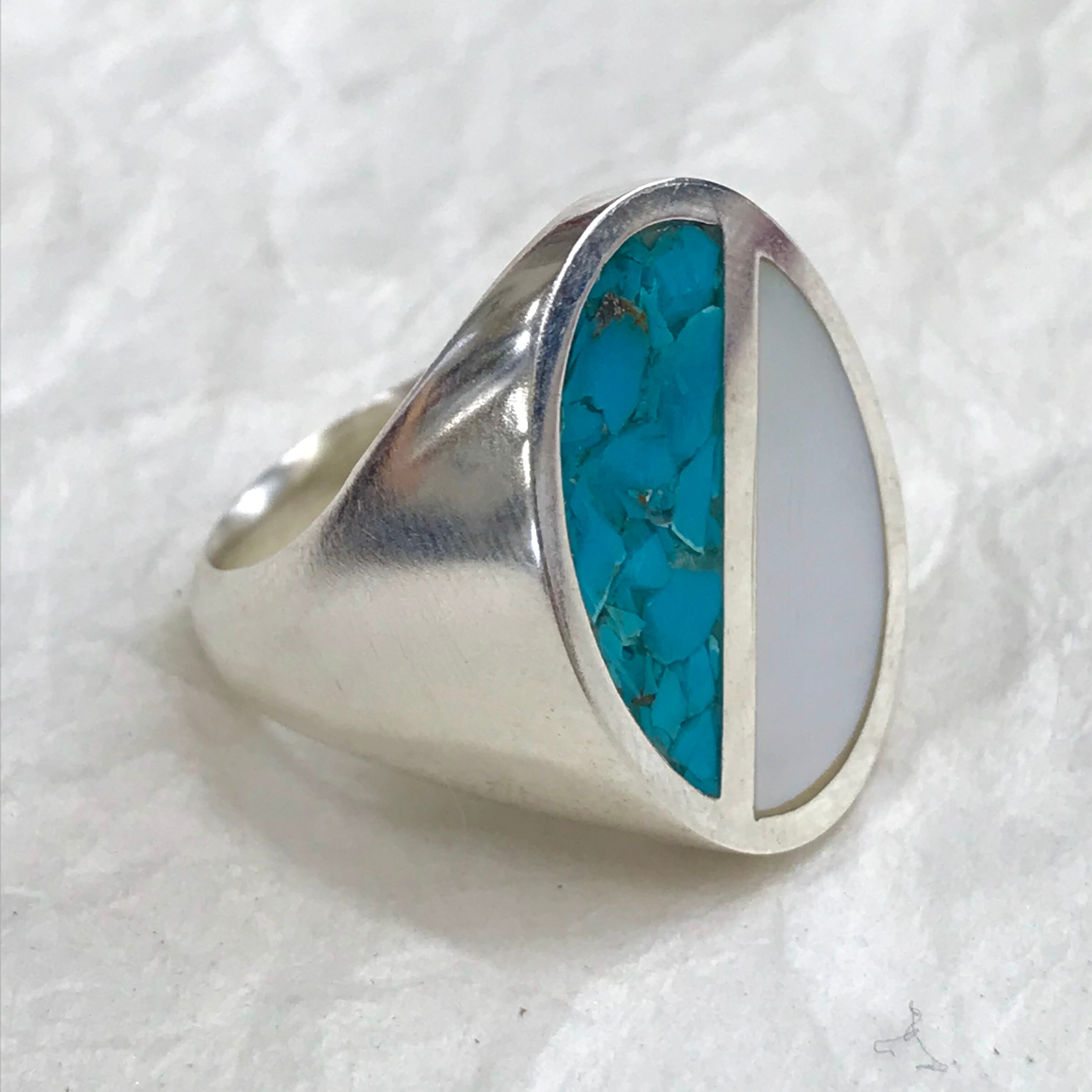 白蝶貝をカットしてはめ込み、ターコイズは砕いてモザイクに敷きつめてsilver925 リング 表面大きさ18mmx23mm 重さ18g